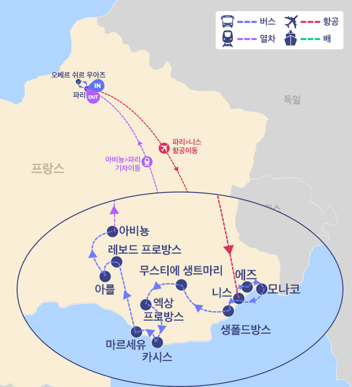 ※ 상기 이미지는 실제와 다를 수 있으며, 현지 사정에 따라 동일 메뉴의 다른 식당으로 대체 될 수 있습니다.● 프랑스내 국내선 이동 1회 (파리-니스) & TGV 이동 1회 (파리-아비뇽) (일부 날짜는 천재지변, 파업 등 현지사정에 따라 변동될 수 있습니다.) ● 45인승 이상 대형버스 이용 ● 더 깊이있는 경험, 안전한 여행을 위한 전일정 전문투어리더 동행[ 입장 관광지 ]* 고흐, 세잔, 모네 등 인상파 화가들의 작품을 감상할 수 있는 오르세 미술관 내부 관람 * 세계에서 현존하는 가장 뛰어난 고딕 양식의 왕궁 아비뇽교황청 - 팔레 데 파프 내부 관람* 프랑스 프로방스를 대표하는 세계 최대 향수 회사 프라고나드 향수 공장 내부 관람* 고흐가 귀를 자르고 입원해서 머물던 병원 에스빠스 반 고흐 내부 관람* 샤갈의 성서에 관한 작품이 가장 많이 전시 되어 있는 니스 샤갈 미술관 내부 관람[ 기타 ]* 최소 출발 인원은 20명 이며 최대 38명까지 진행될 수 있습니다.* 20명 이상 출발시 인천공항에서부터 도착까지 전일정 전문투어리더가 동행 안내해 드립니다.* 파리는 현지 가이드가 동행하며, 파리 외 남프랑스 지역은 전문투어리더가 진행 안내드립니다. * 니스 축제 등 현지 호텔 사정에 따라 주변의 다른 도시의 호텔로 변경 될 수 있습니다.